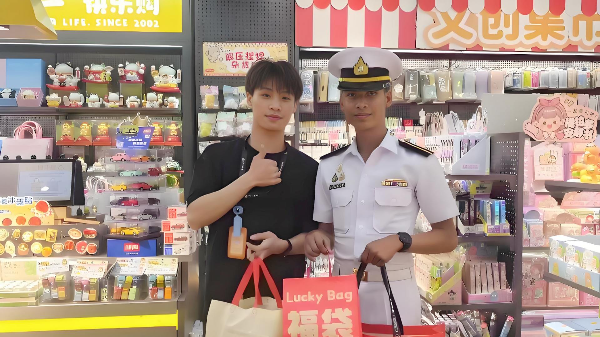 在交流的过程中,一位泰国海军深受感动,他用不太流利的中文表达着对店员们热情服务的感谢,并主动邀请其他队友前来店铺,一同感受这份来自异国的热情与周到。