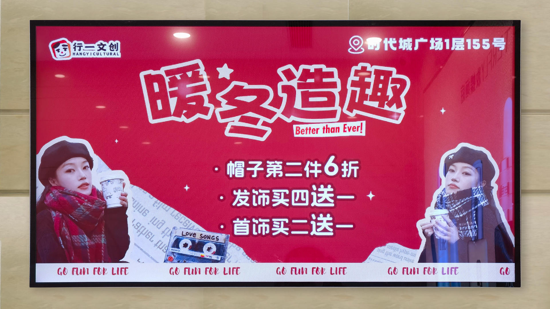 行一文创南城时代城店暖冬造趣好物活动上新,帽子第二件6折,发饰买4送1、首饰买2送1,同时登上南城时代城的商圈门户广告。为顾客的出行穿搭增添乐趣,也给顾客带来冬日温暖,同时为即将到来的圣诞节增添节日气氛!